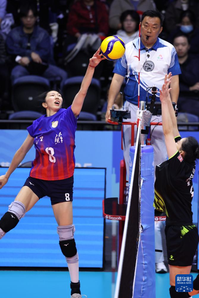11月18日,江苏队球员张常宁(左)在比赛中进攻。