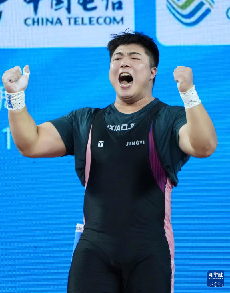 11月19日,辽宁队选手邹元清在挺举比赛中试举成功后庆祝。最终,他获得季军。