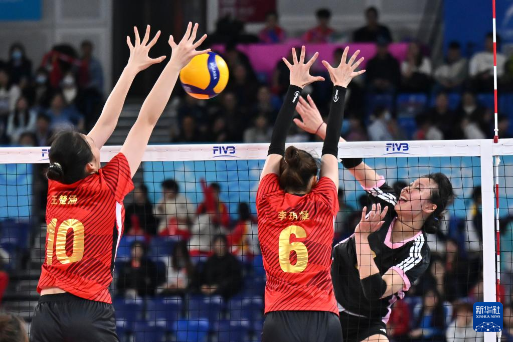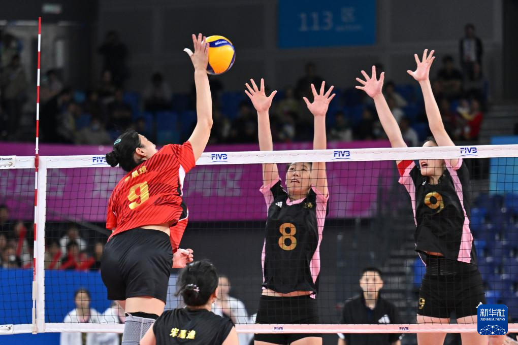 11月18日,山东队球员王楚涵(左)、李玥凝(中)拦网。