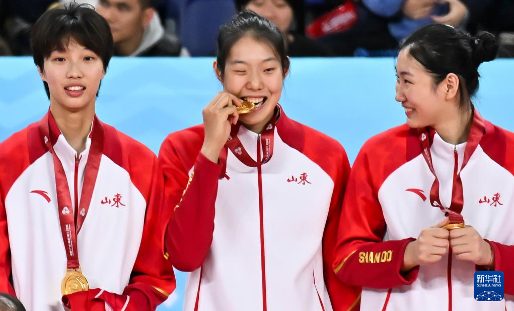11月18日,山东队球员郭湘玲(中)在领奖台上咬金牌。