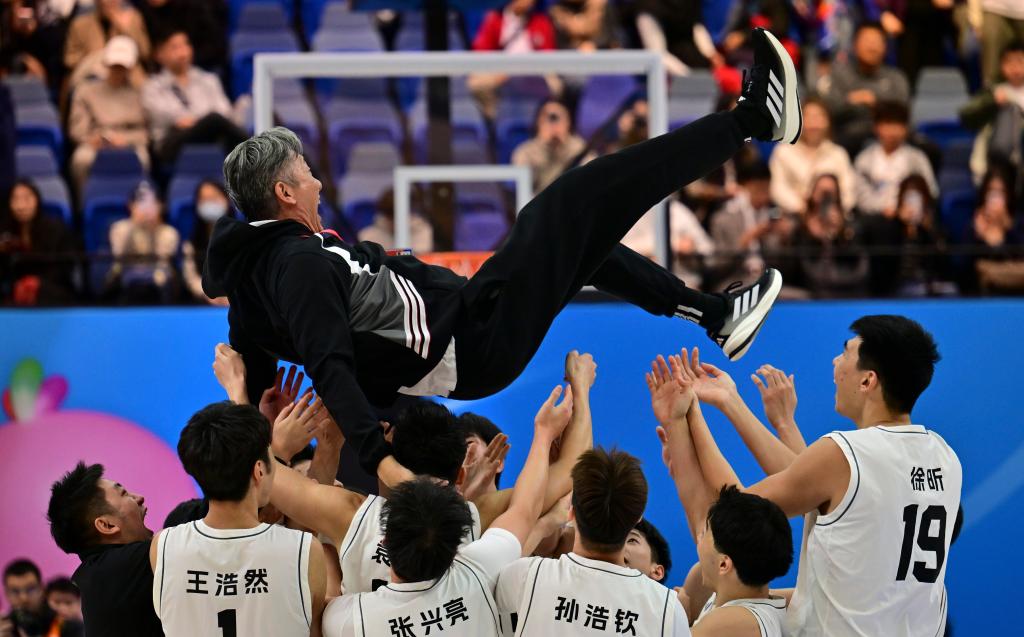 夺冠后,激动的广东队将士们在球场中央把主帅郑永刚高高抛起。