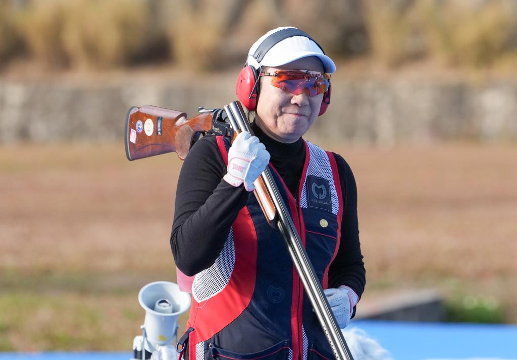 11月20日,第十五届全国运动会射击项目飞碟多向混合团体金牌赛在广州举行,湖南队组合郭雨浩/刘英姿获得冠军。湖南队选手刘英姿在比赛后庆祝。新华社记者 肖恩楠 摄