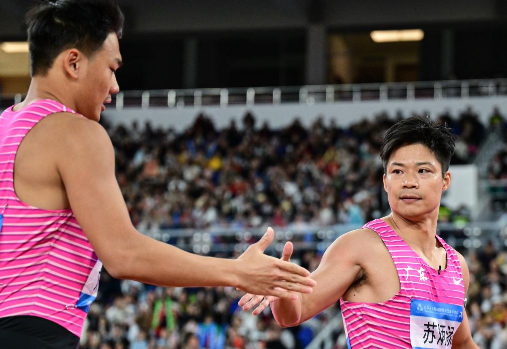 新华社广州11月20日电(记者周畅、刘旸、张武岳)苏炳添高举右手,向几近满员的观众席致意,随后和队友一起,双手从右下方合拢后往前发出“冲击”。