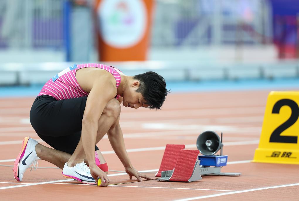 职业生涯的最后一战,苏炳添是接力队伍里的第一棒。当他来到起点位置,拿出了一个卷尺,仔细丈量着距离,调整着起跑器的位置。“苏教授”的严谨,在此刻得以彰显,也似乎让人感受到,他无比认真地对待自己的最后一役。
