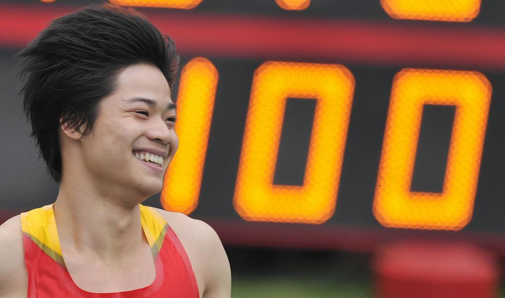 2009年12月12日,苏炳添在东亚运动会男子100米决赛夺冠后露出笑容。新华社记者 吕小炜 摄