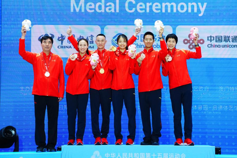 11月16日,分获冠、亚、季军的江苏队选手杨恒郁(右三)、傅颖(左二)、钱佳睿(右一)在颁奖仪式上与教练合影。新华社记者 朱炜 摄
