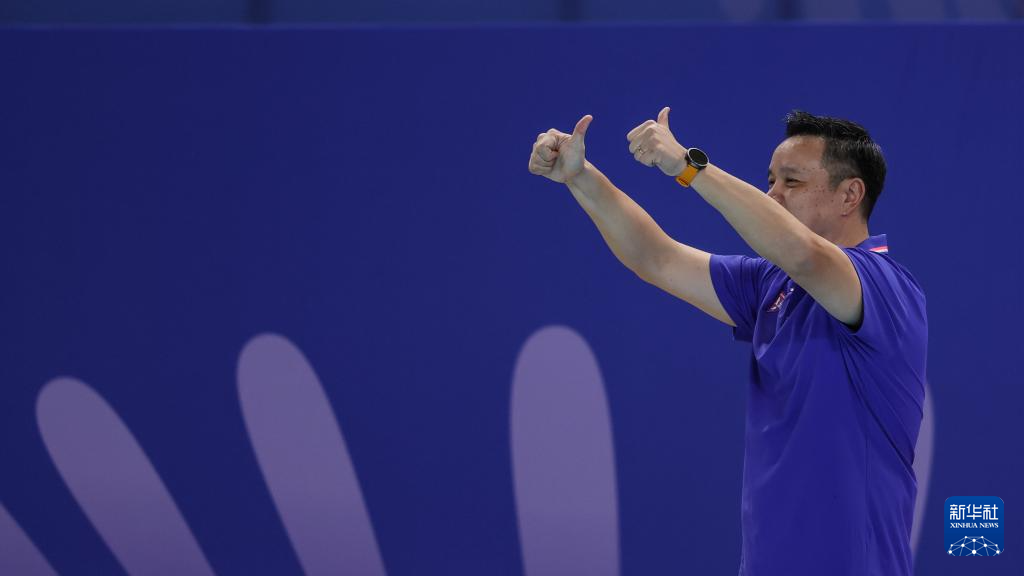 11月21日,上海队主教练李文华(前)在泳池中庆祝。