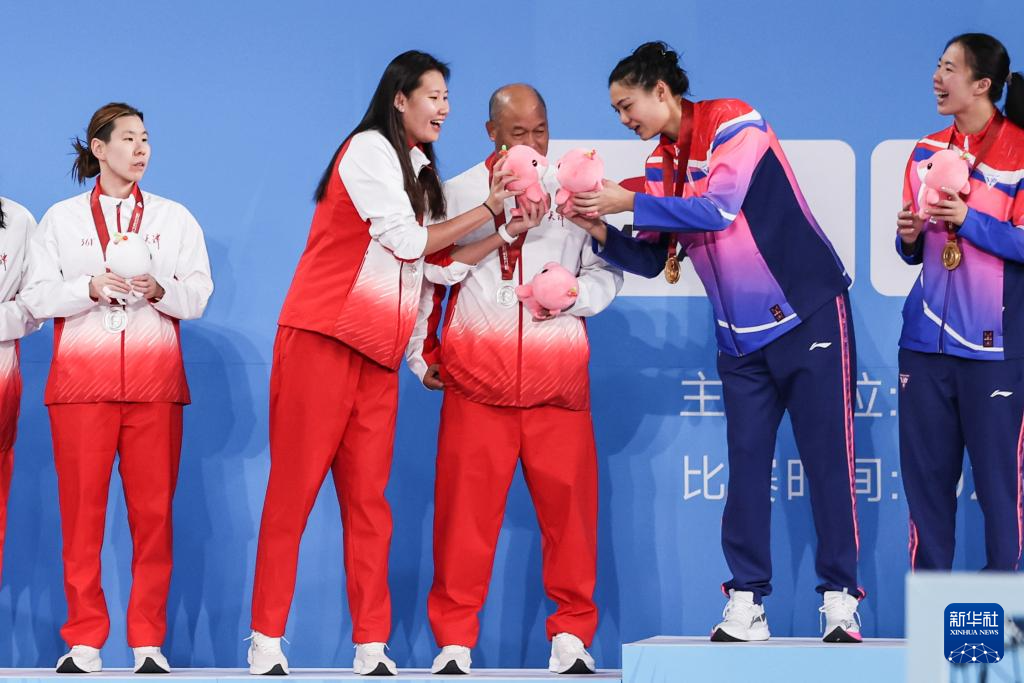 11月21日,天津队守门员杜馨玥(左二)与上海队守门员沈轶能(右二)在颁奖仪式中互动。