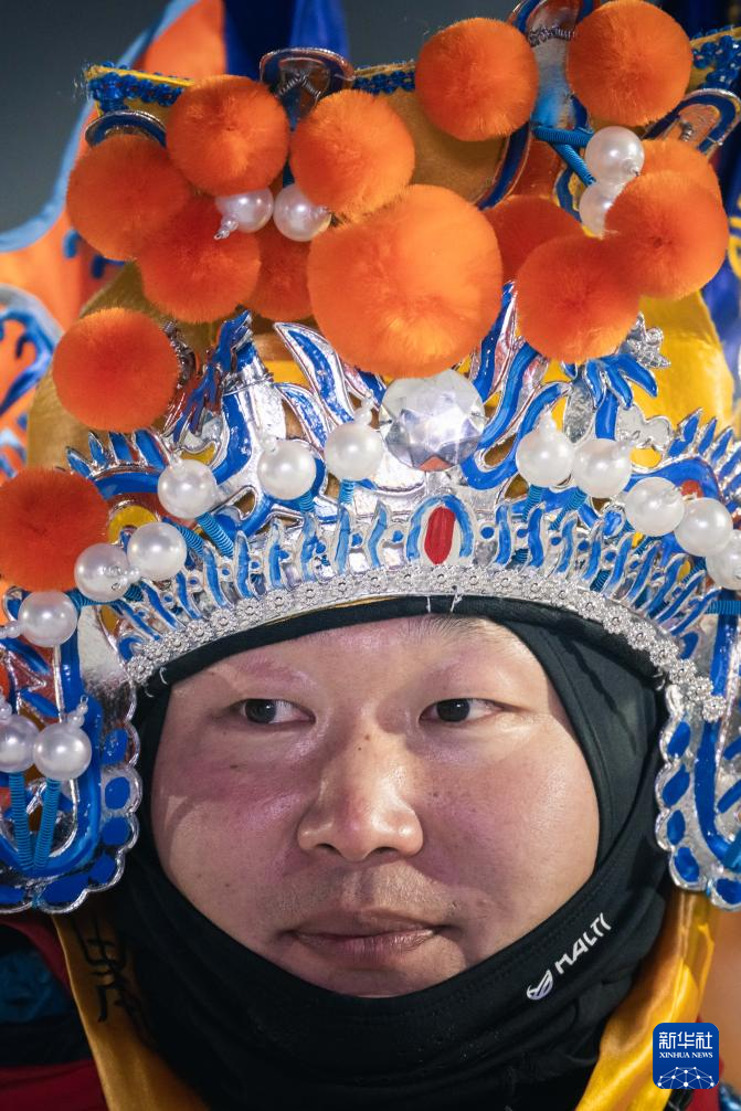 11月21日,工作人员帮助一名滑雪者穿戴京剧服饰。