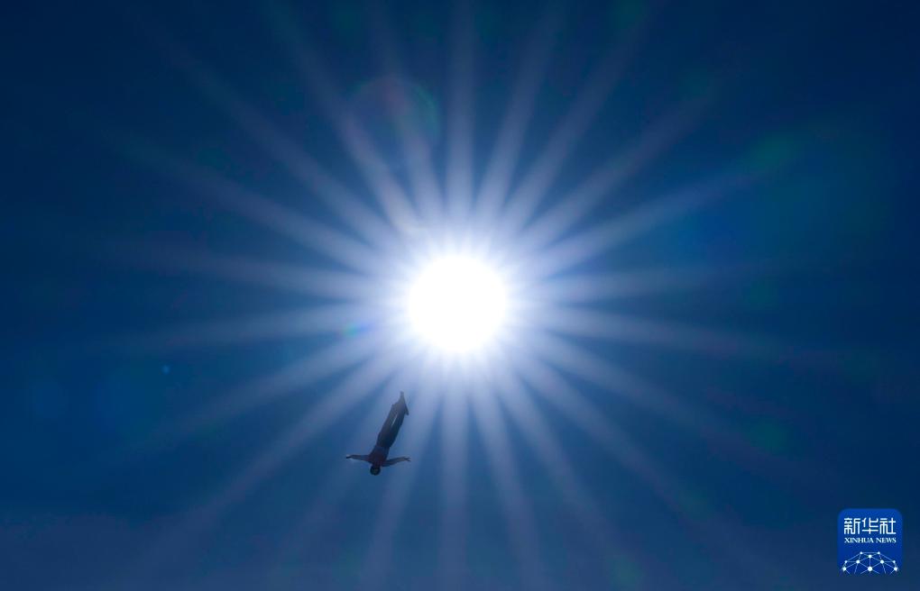 2012年1月7日,第12届全国冬季运动会自由式滑雪空中技巧规定动作的比赛在吉林市北大壶滑雪场举行。图为齐齐哈尔市队的女选手孔凡钰在比赛中进行空中翻转时,仿佛从太阳的光晕上滑下来。新华社记者费茂华摄