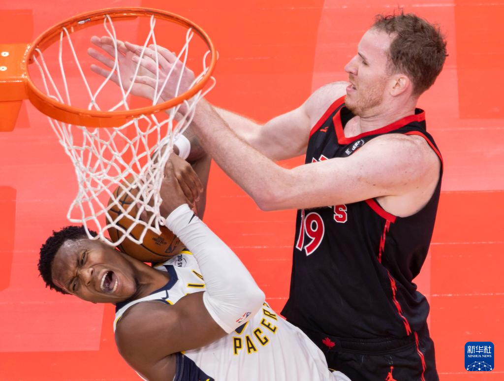 11月26日,猛龙队球员迪克(右)与步行者队球员罗宾逊-厄尔在比赛中争抢篮板球。