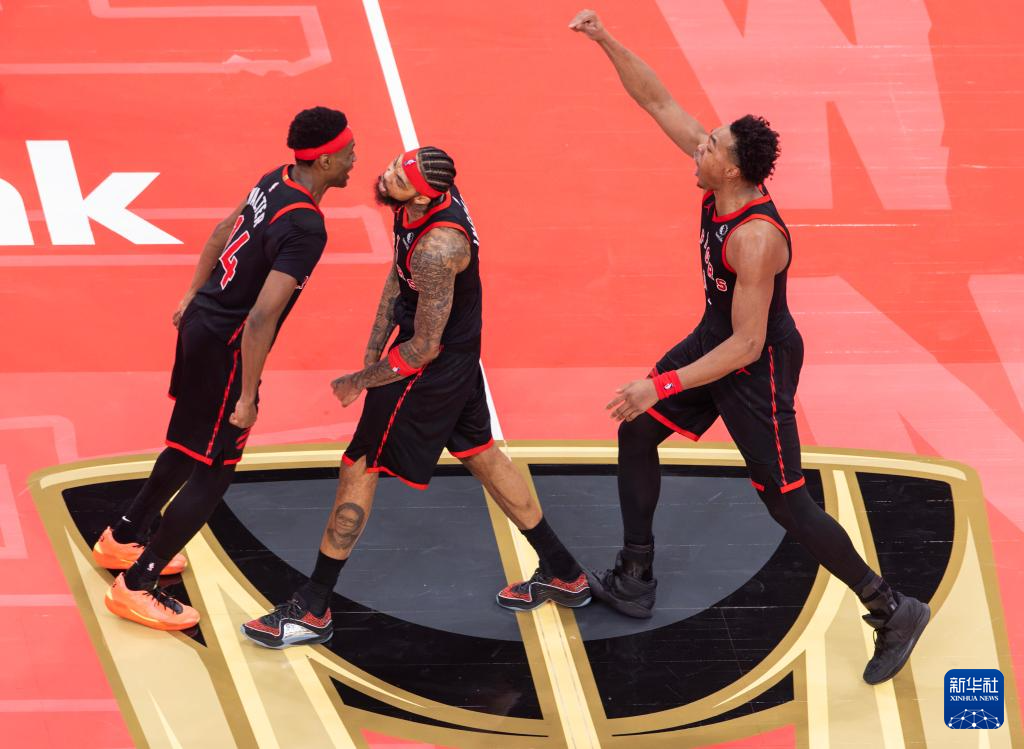 11月26日,猛龙队球员英格拉姆 (中)在比赛中命中决胜球后与队友沃尔特(左)、巴恩斯庆祝。