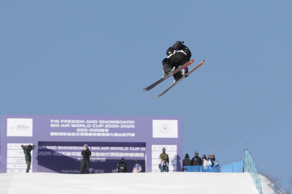 中国自由式滑雪运动员黄琮森在比赛中尝试抓板