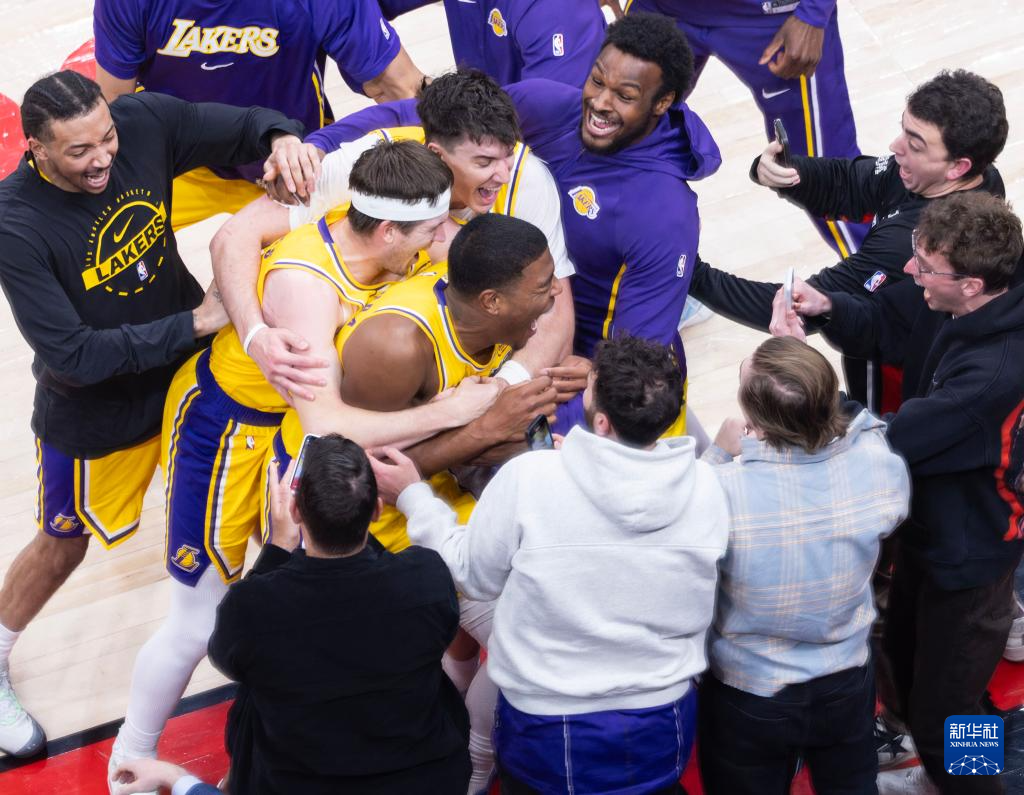 12月4日,湖人队球员八村塁(下)与队友在赛后庆祝胜利。