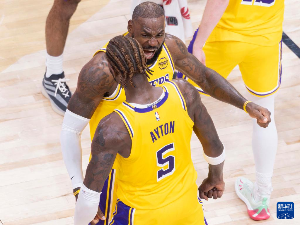 12月4日,湖人队球员詹姆斯(后)与队友艾顿在比赛后庆祝胜利。