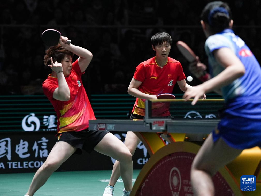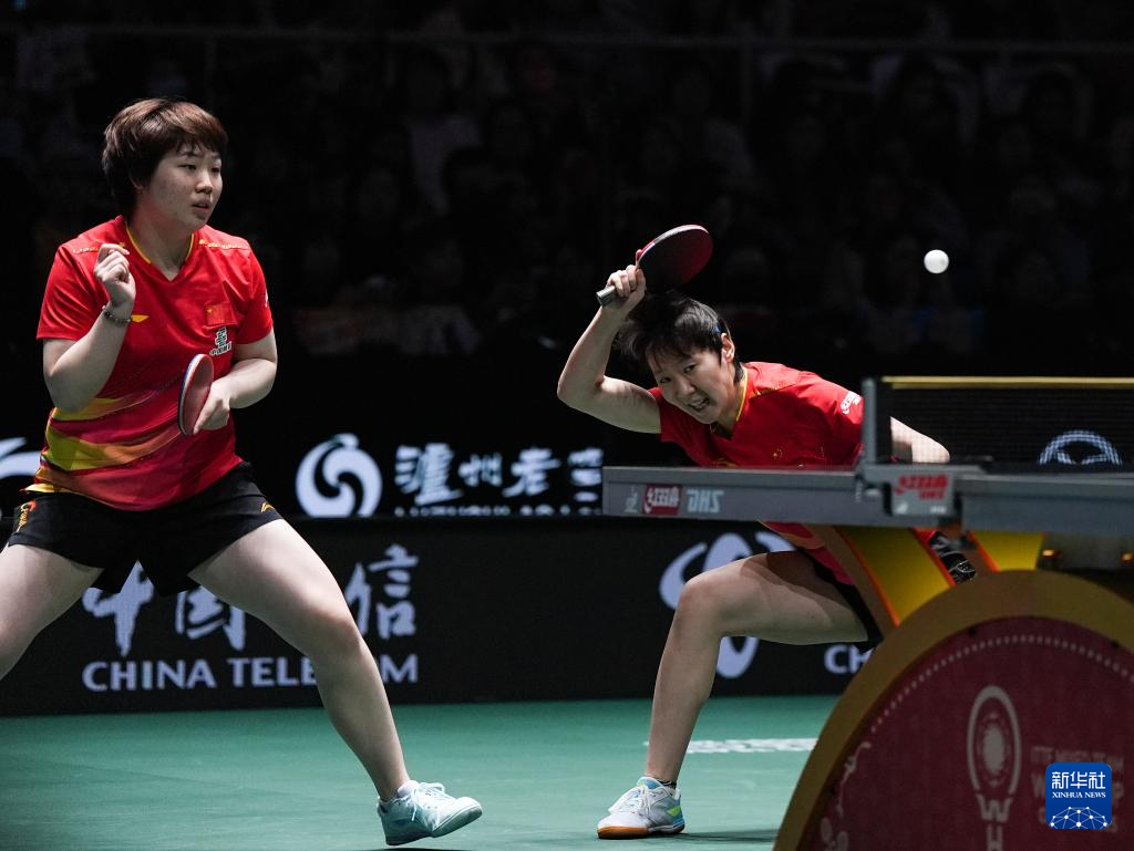 12月6日,中国队组合王曼昱(右)/蒯曼在比赛中。最终,她们在女双比赛中1比0战胜日本队组合张本美和/大藤沙月。