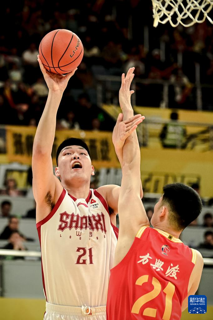 12月12日,山西汾酒队球员刘传兴(左)在比赛中投篮。