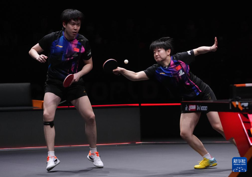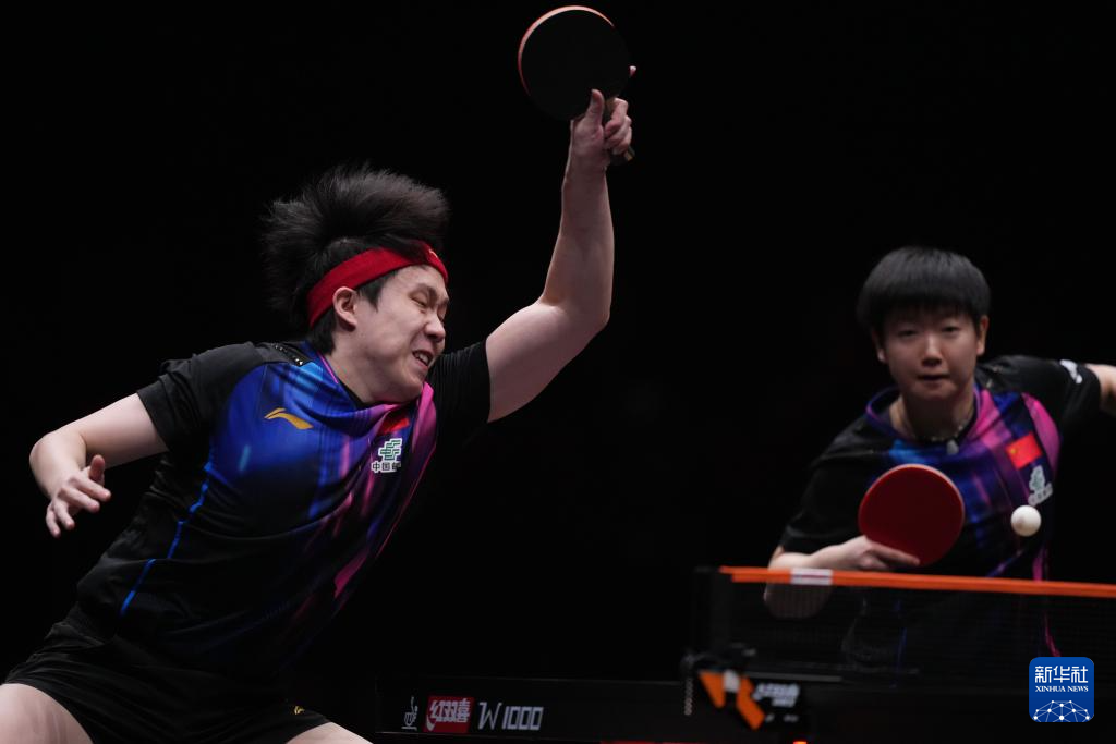 12月13日,王楚钦/孙颖莎(右)在比赛中。
