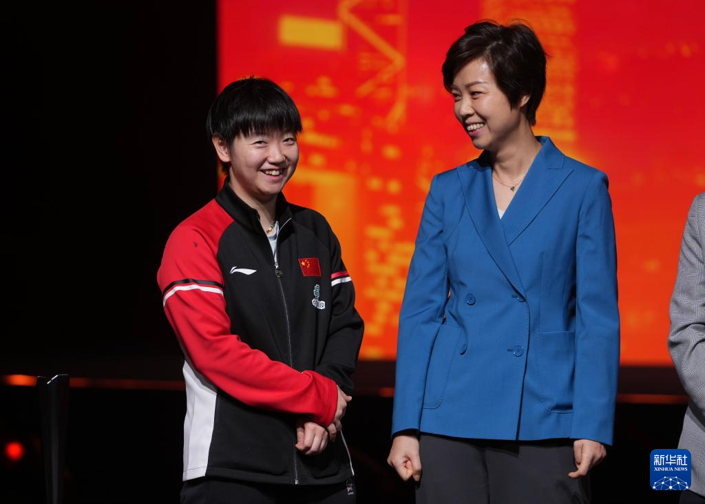 12月13日,孙颖莎和颁奖嘉宾张怡宁(右)在颁奖仪式上。