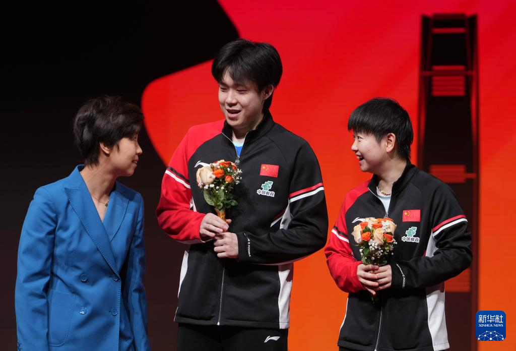 12月13日,亚军中国组合王楚钦(中)/孙颖莎和颁奖嘉宾张怡宁在颁奖仪式上。