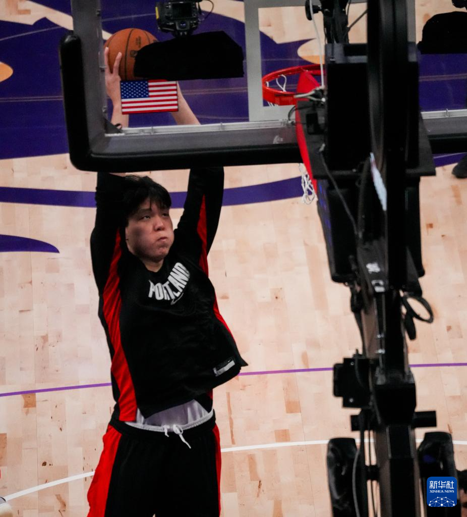 12月20日,开拓者队球员杨瀚森在赛前热身。