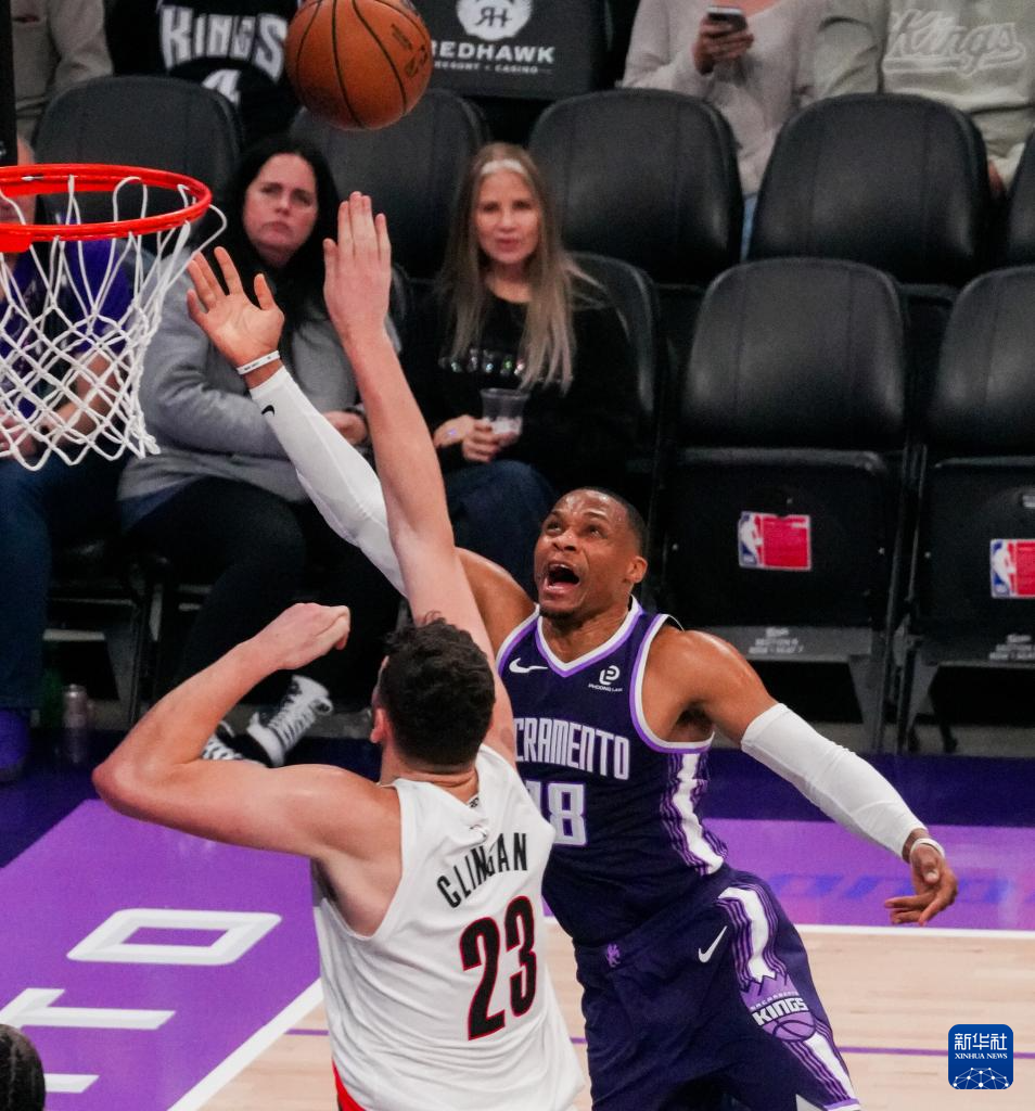 12月20日,国王队球员拉塞尔·威斯布鲁克(右)在比赛中上篮。