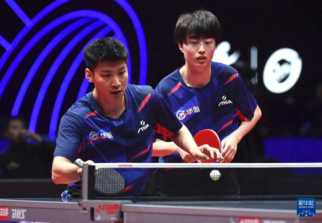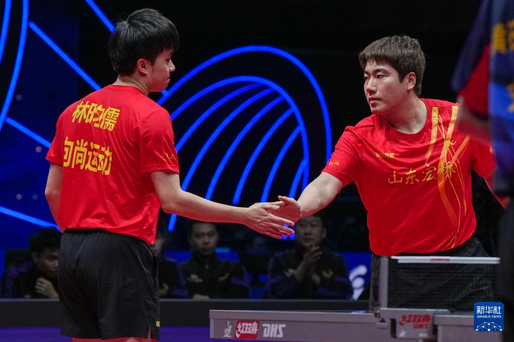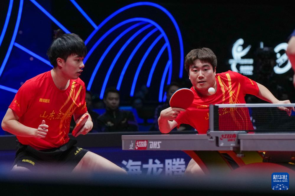 12月28日,山东魏桥·向尚运动队组合梁靖崑(右)/林昀儒在双打比赛中。他们3比0战胜黄石华新队组合薛飞/刘冠成。