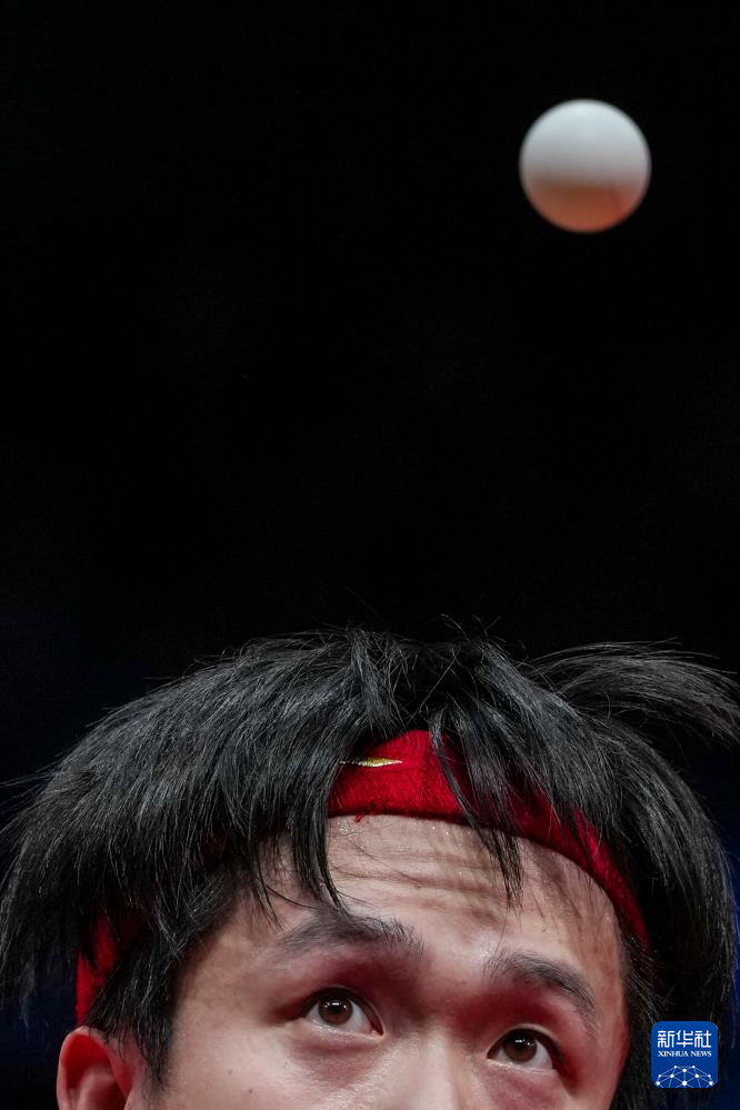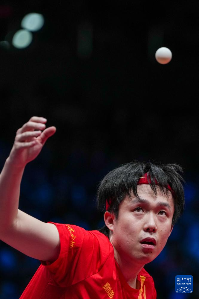 12月28日,山东魏桥·向尚运动队选手王楚钦在单打比赛中发球。他3比1战胜黄石华新队选手向鹏。
