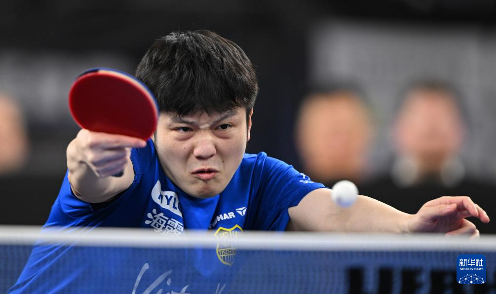1月4日,萨尔布吕肯队球员樊振东在男子单打比赛中回球。最终他3比0战胜富尔达-马伯策尔队球员奥恰洛夫。