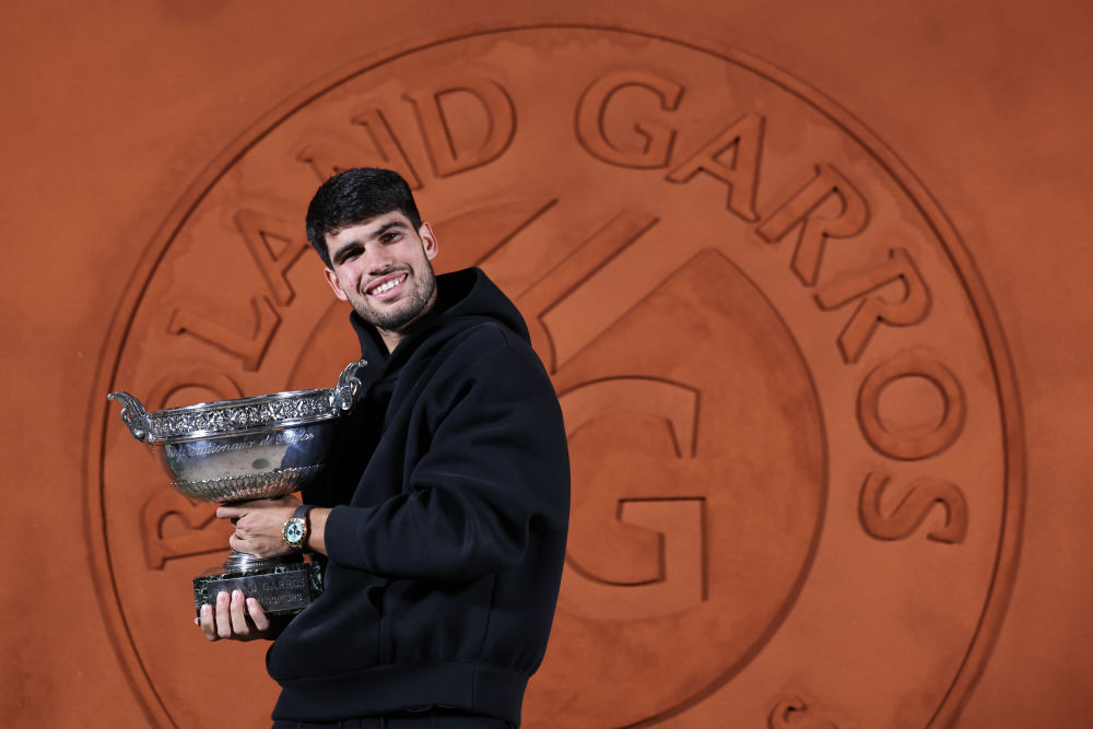 2025年6月8日,阿尔卡拉斯在拍照仪式上与奖杯合影。当日,在巴黎进行的2025法国网球公开赛男单决赛中,西班牙选手阿尔卡拉斯3比2战胜意大利选手辛纳,夺得冠军。新华社记者 李京 摄