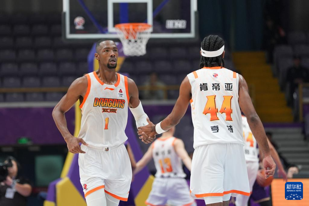 1月15日,江苏肯帝亚队球员贾尔斯(左)与队友亨特在比赛中击掌。