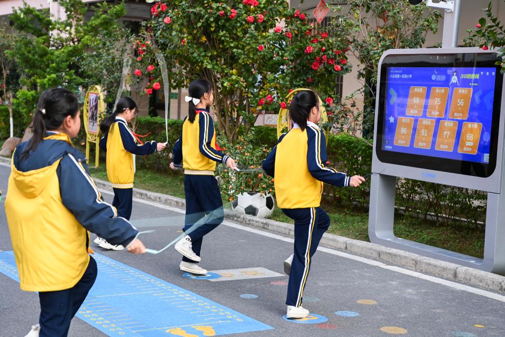 在兴业县第一实验小学,学生们利用AI体育设备进行跳绳练习