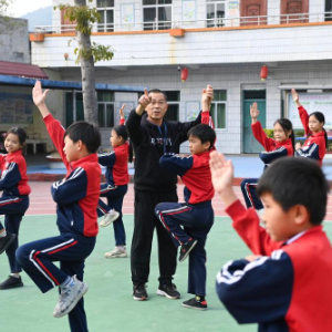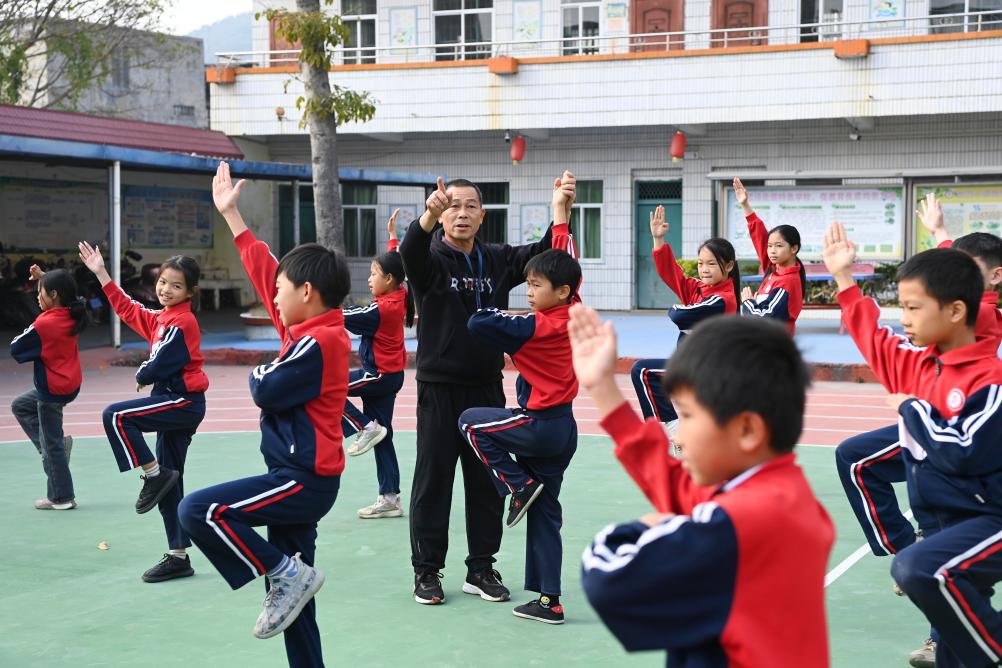 在兴业县石南镇东周小学,武术教练倪济秋在纠正学生的动作