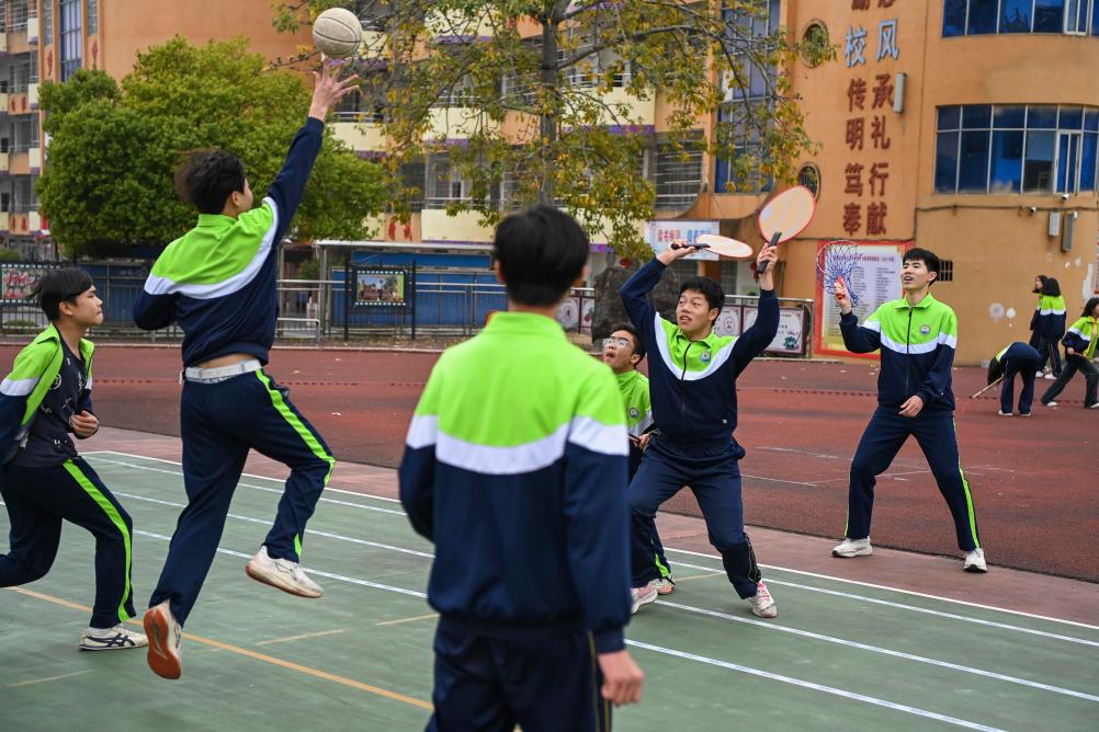 玉林市民族中学学生在练习传统民族体育项目珍珠球