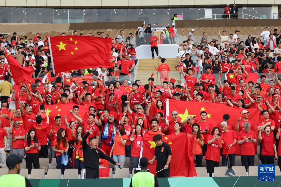 1月24日,中国队球迷赛前在看台上为球队加油。