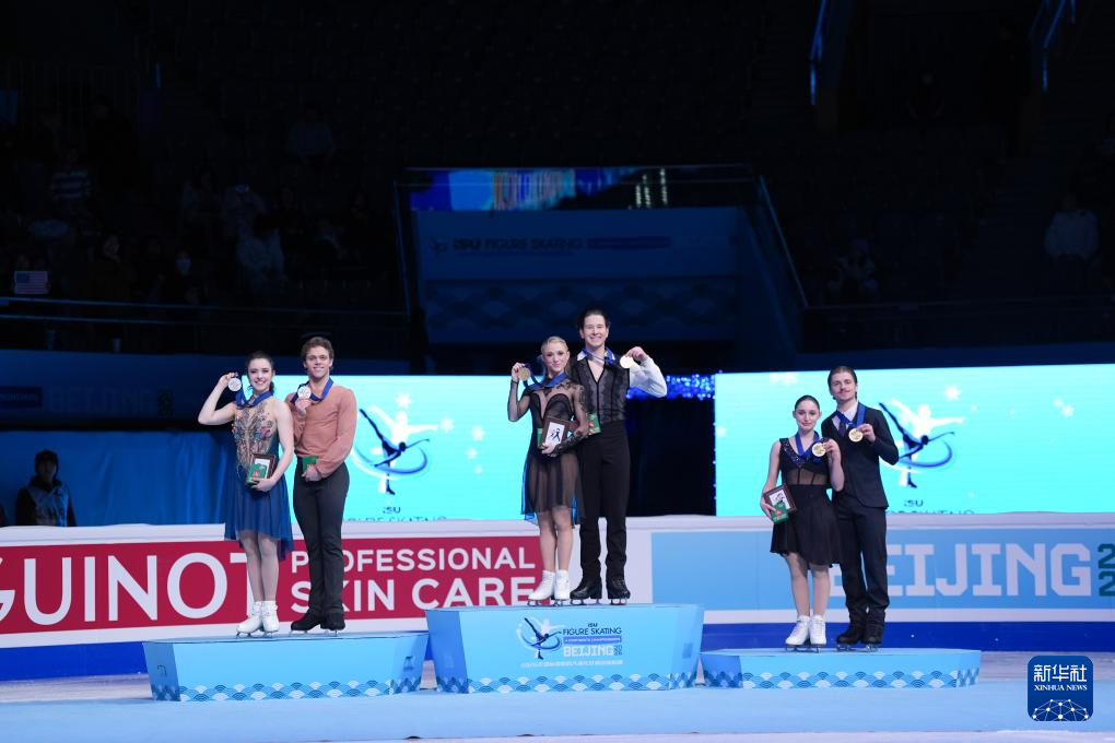 1月23日,冠军美国选手埃米莉亚·津加斯(左三)/瓦迪姆·科列斯尼克(左四)、亚军美国选手卡罗琳·格林(左一)/迈克尔·帕森斯(左二)与季军美国选手乌娜·布朗(右二)/盖奇·布朗在颁奖仪式上。