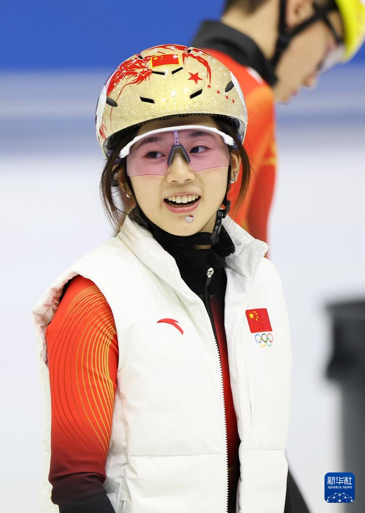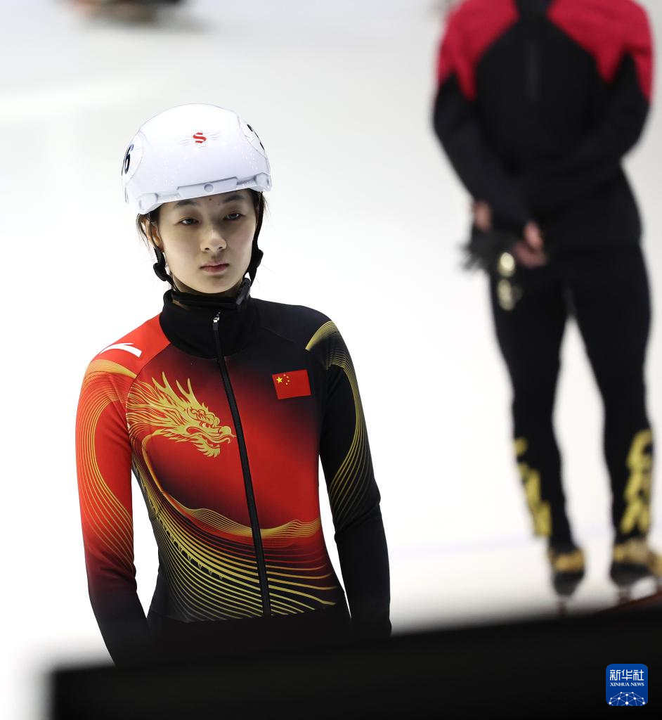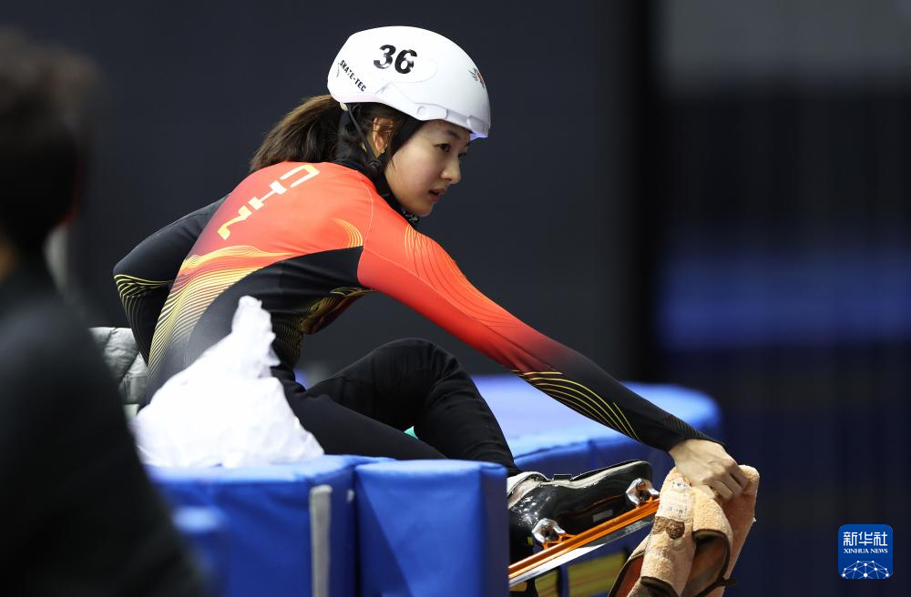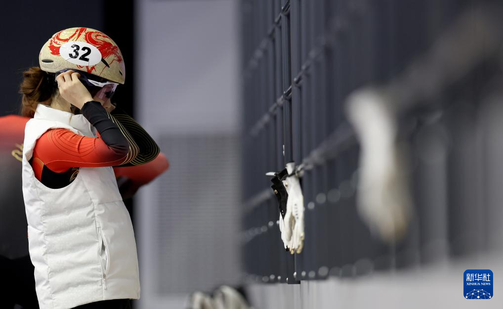 1月29日,中国短道速滑队选手杨婧茹在训练前准备。