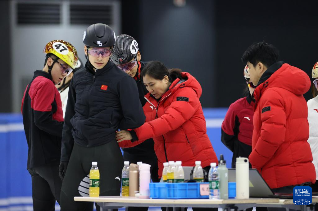 1月29日,中国短道速滑队教练张晶(中)在训练中为队员刘少昂(左二)整理服装。