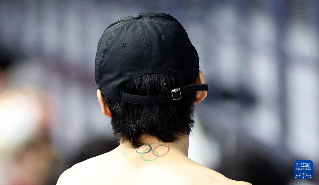 这是1月29日拍摄的中国短道速滑队选手林孝埈脖颈处的奥运五环纹身。