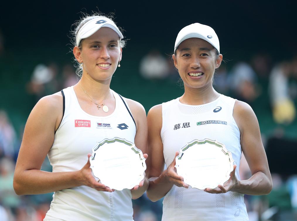 2022年7月10日,张帅(右)/梅尔滕斯在颁奖仪式上。当日,在英国伦敦举行的2022温布尔登网球公开赛女子双打决赛中,张帅(中国)/梅尔滕斯(比利时)组合以0:2不敌捷克组合克雷吉茨科娃/西尼亚科娃,获得亚军。新华社记者 李颖 摄
