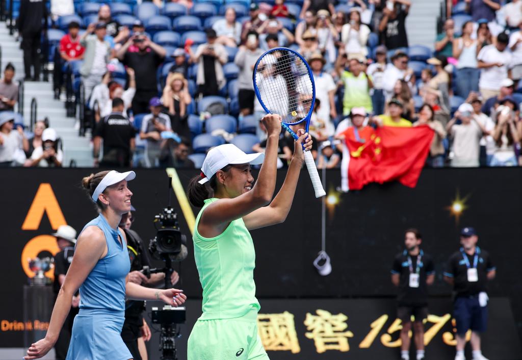 1月25日,张帅(前左)与梅尔滕斯(前右)在赛后庆祝胜利。当地时间1月25日,在墨尔本进行的2026年澳大利亚网球公开赛女双第二轮比赛中,张帅(中国)/梅尔滕斯(比利时)2:1战胜约维奇(美国)/姆博科(加拿大),晋级16强。新华社发(胡泾辰摄)