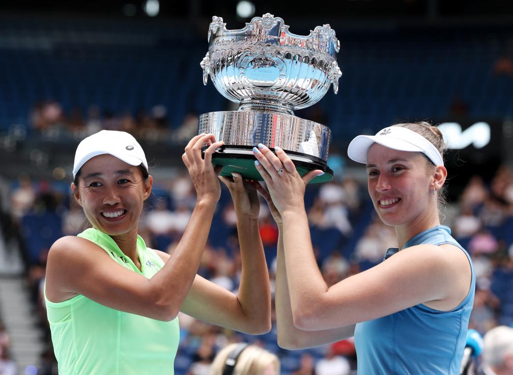 在31日进行的2026年澳大利亚网球公开赛女双决赛中,张帅搭档比利时选手梅尔滕斯以7:6(4)、6:4力克达尼丽娜(哈萨克斯坦)/克鲁尼奇(塞尔维亚),夺得冠军。这是张帅继2019年澳网、2021年美网之后,职业生涯的第三座大满贯女双冠军奖杯。