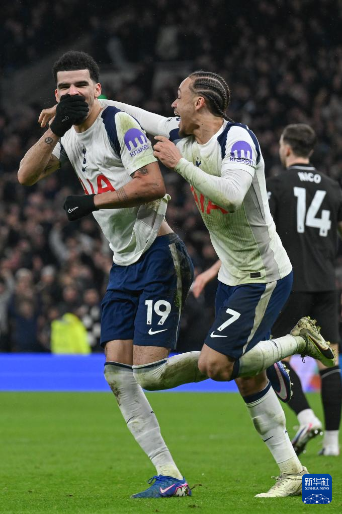 2月1日,热刺队球员索兰克(左)进球后与队友西蒙斯庆祝。