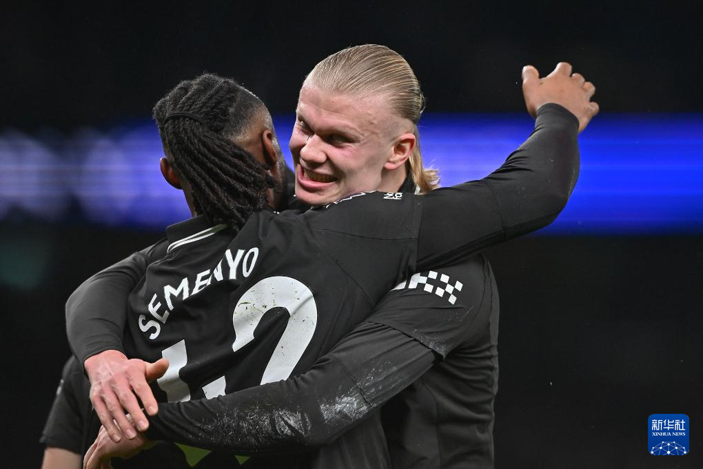 2月1日,曼城队球员塞门约进球后与队友哈兰德(右)庆祝。