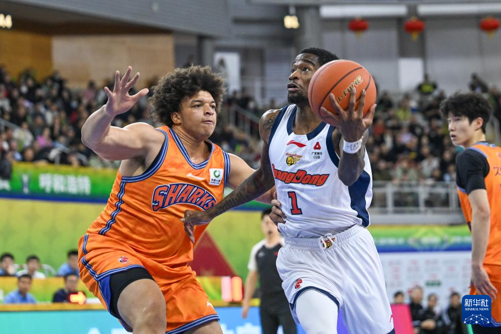 2月6日,广东东阳光队球员张皓嘉(右)在比赛中防守上海久事队球员偰李永炜。