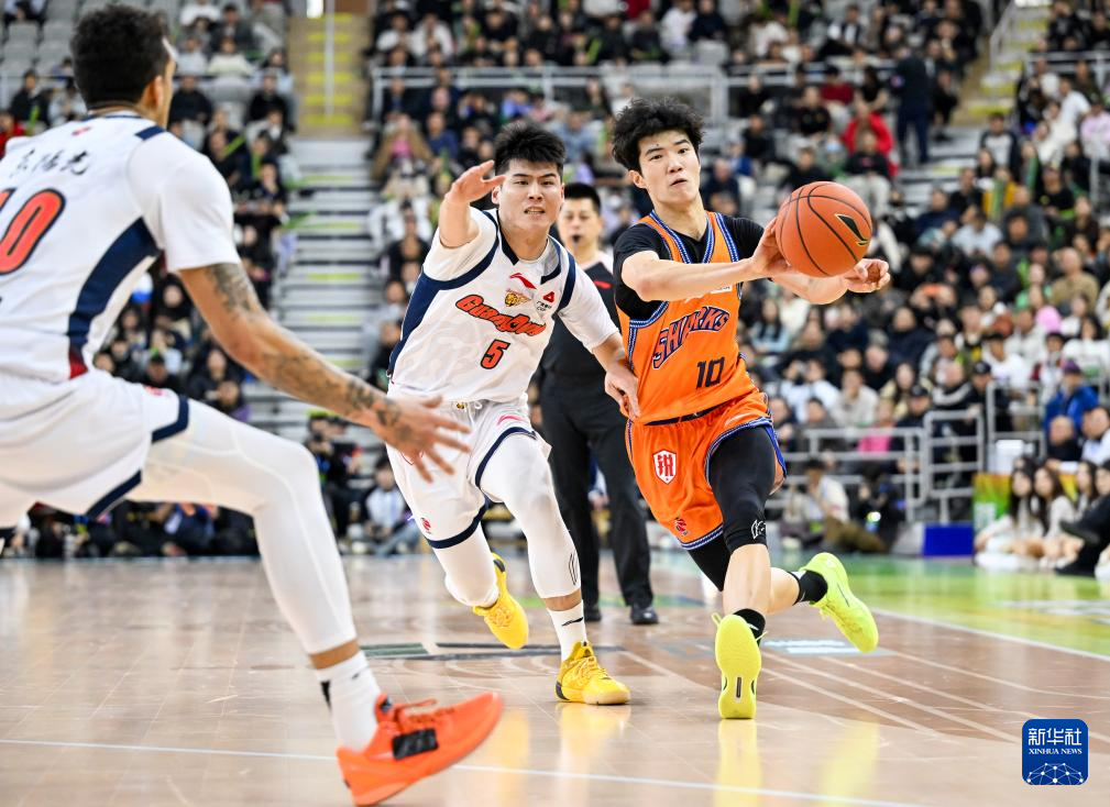 2月6日,上海久事队球员偰李永炜(右一)在比赛中传球。