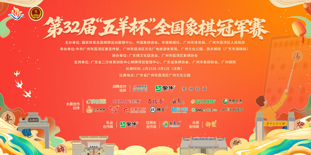 新华社广州2月6日电 第32届“五羊杯”全国象棋冠军赛决赛阶段赛事将于2月25日至3月1日在广州举行。作为中国象棋协会新赛事体系下的首个A级赛事,本届比赛首次设立公开组与元老组两个独立竞赛组别,赛事总奖金突破百万元。