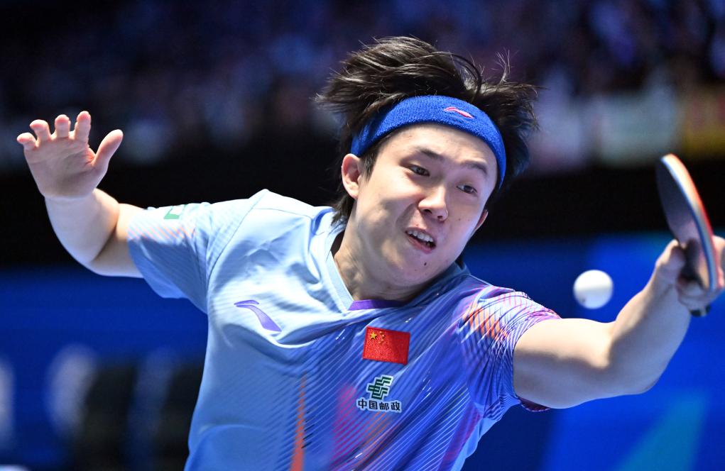 2月6日,王楚钦在比赛中回球。