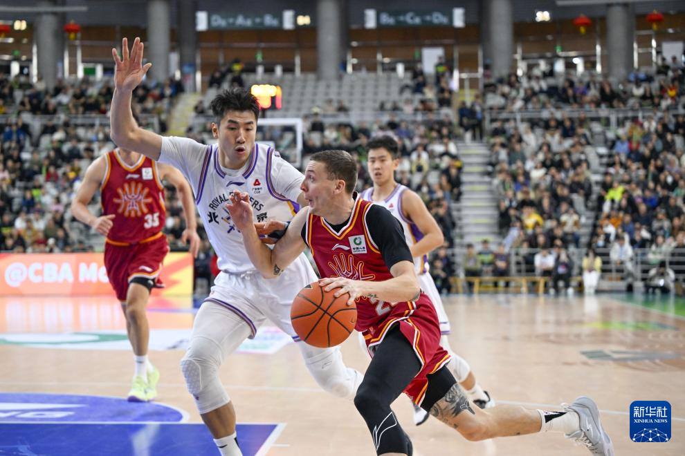 2月7日,北京控股队球员罗汉琛(右)在比赛中带球突破。