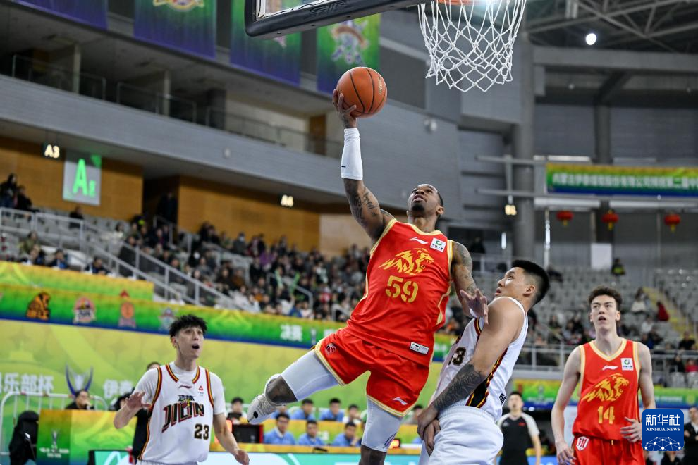 2月7日,吉林长白山恩都里队球员栾利程(前中)在比赛中上篮。